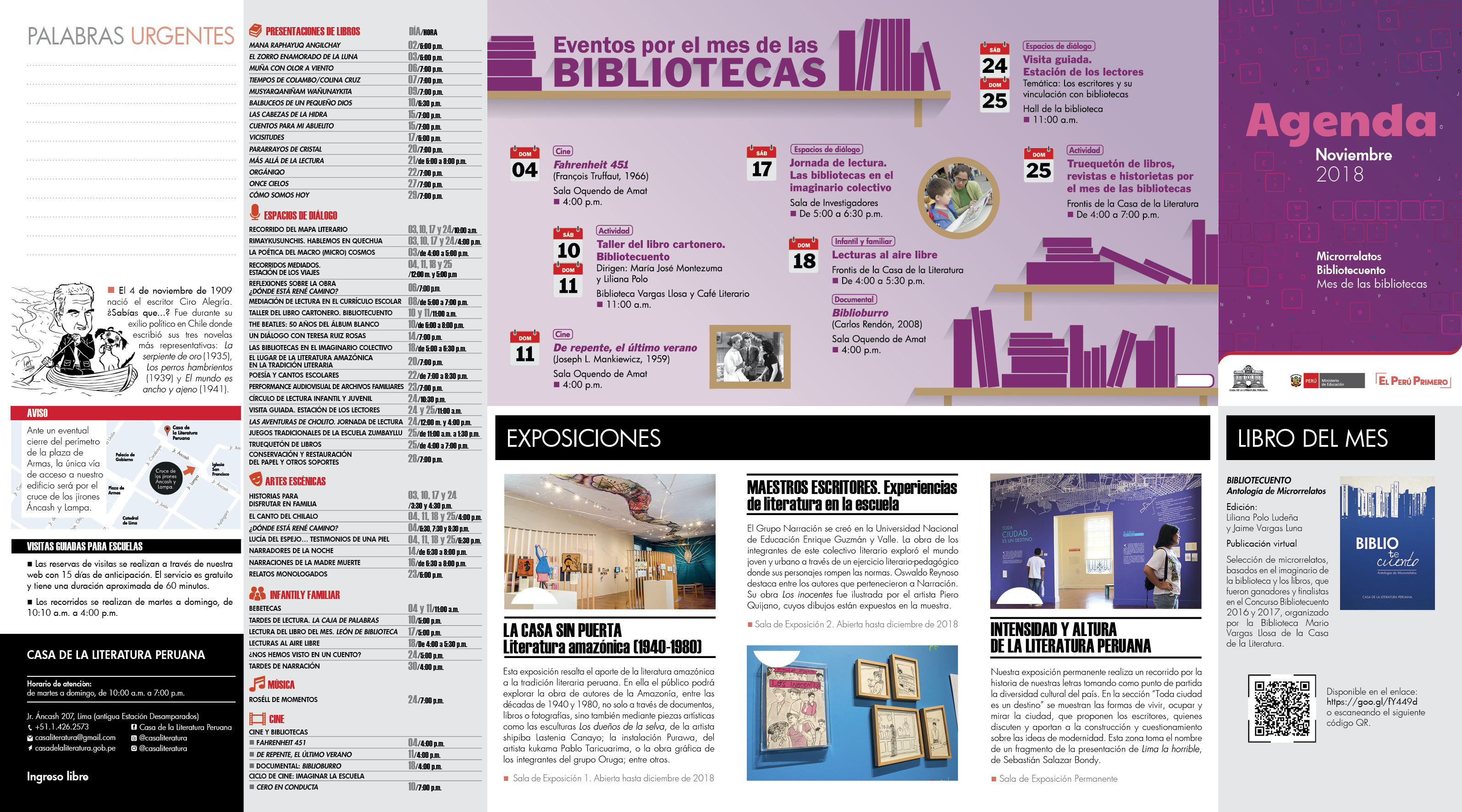 En la Casa de la Literatura Peruana realizamos diversas actividades como exposiciones literarias, proyecciones de cine, actividades infantiles, funciones de teatro, recitales de poesía, lecturas animadas, espectáculos musicales, conferencias, congresos, seminarios, préstamo de libros para lectura en sala y mucho más.