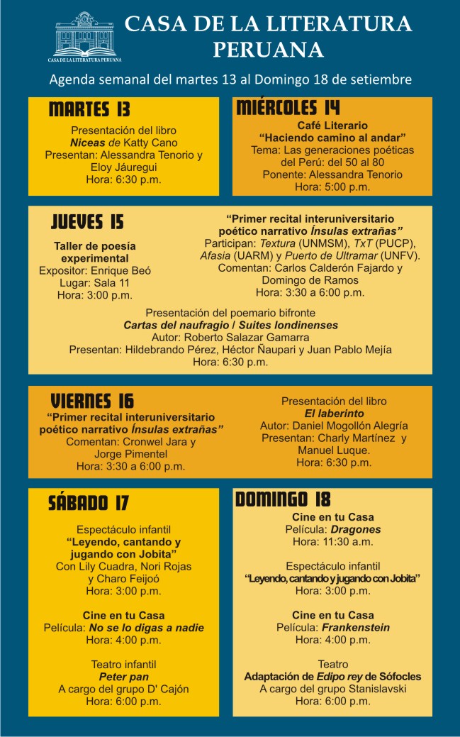 Agenda del martes 12 al domingo 17 de setiembre 2023