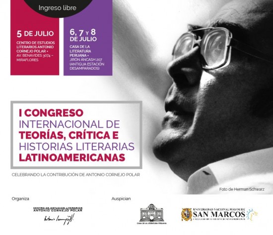 Del martes 5 al viernes 8 de julio se realizará el I Congreso Internacional de Teorías, Crítica e Historias Literarias Latinoamericanas celebrando la contribución del profesor y crítico literario Antonio Cornejo Polar. La inauguración será el martes 5 en el Centro de Estudios Literarios Antonio Cornejo Polar (Av. Benavides 3074, Miraflores), a las 3:00 p.m. El ingreso es libre.