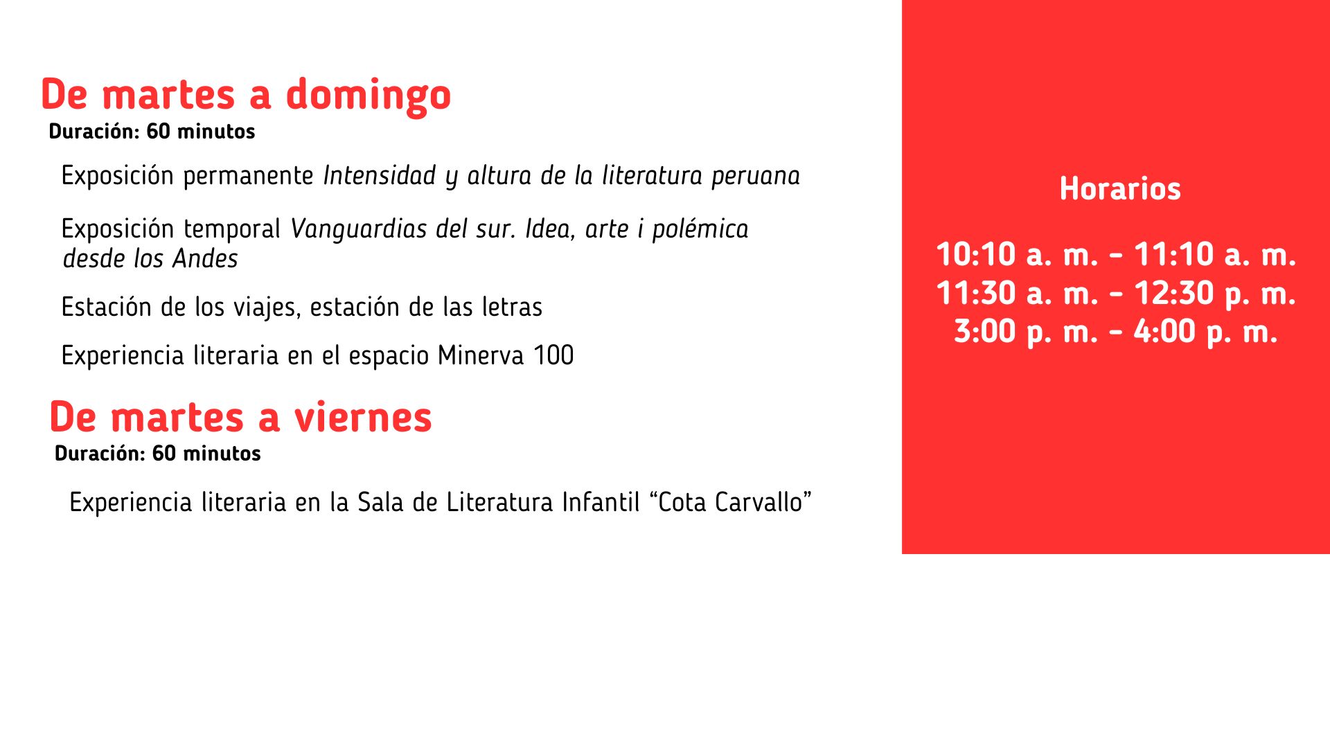 *El aforo máximo de atención de la Casa de la Literatura Peruana en los horarios ofrecidos es de 120 personas.